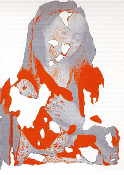 - 科学的調査に基づく作品の現在の状態 (グレー:オリジナル、赤:加彩、白:オリジナルではない部分)(c)Lab.Art.UCL